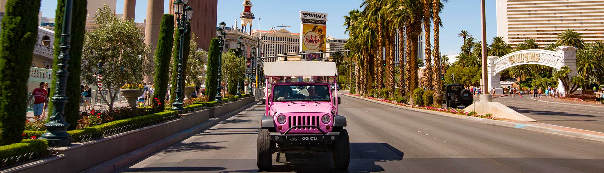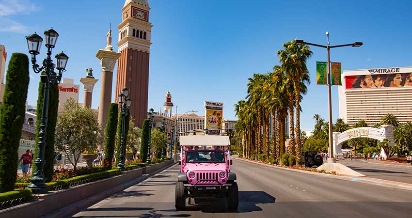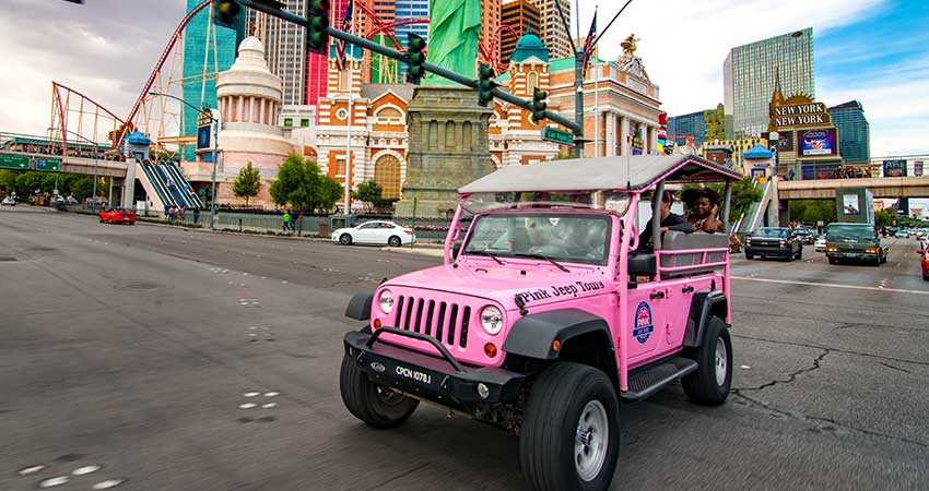 Explore Las Vegas in style and get an intimate look at one of the country’s most iconic cities. Your Certified Interpretive Guide will pick you up at your hotel in one of our custom Pink® Jeep® Wranglers, prepared to provide an unforgettable day. Take photos while enjoying trivia with your entertaining and informative guide. Our open-air vehicle puts you at the center of it all with great views in a pleasant desert setting.